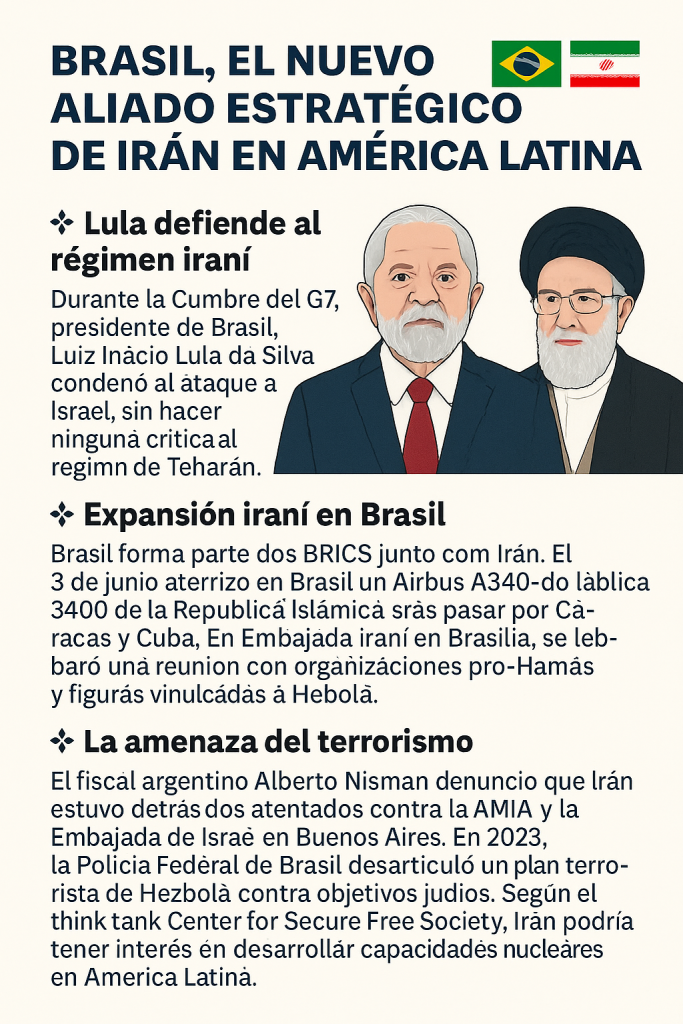En este clima de creciente tensión, crecen las alertas por posibles movimientos del régimen iraní en América Latina. La Policía Federal brasileña ya frustró en 2023 un atentado planeado por Hezbolá, proxy iraní, en la Operación Trapiche. La adhesión de Irán a los BRICS ha facilitado la entrada de funcionarios iraníes a Brasil. El 3 de junio aterrizó en Brasilia un avión del gobierno iraní procedente de Teherán, vía Caracas y La Habana, el segundo en menos de dos meses.