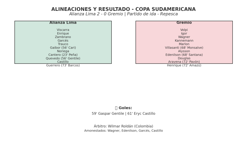LIMA, 17 julio – Alianza Lima dio un paso firme hacia los octavos de final de la Copa Sudamericana al imponerse por 2-0 sobre Gremio de Porto Alegre en el partido de ida de la repesca, celebrado en el estadio Alejandro Villanueva. Los goles de Gaspar Gentile y Eryc Castillo desataron la euforia blanquiazul en una noche que recordó la reciente eliminación de Boca Juniors a manos del equipo peruano en la fase previa de la Libertadores.