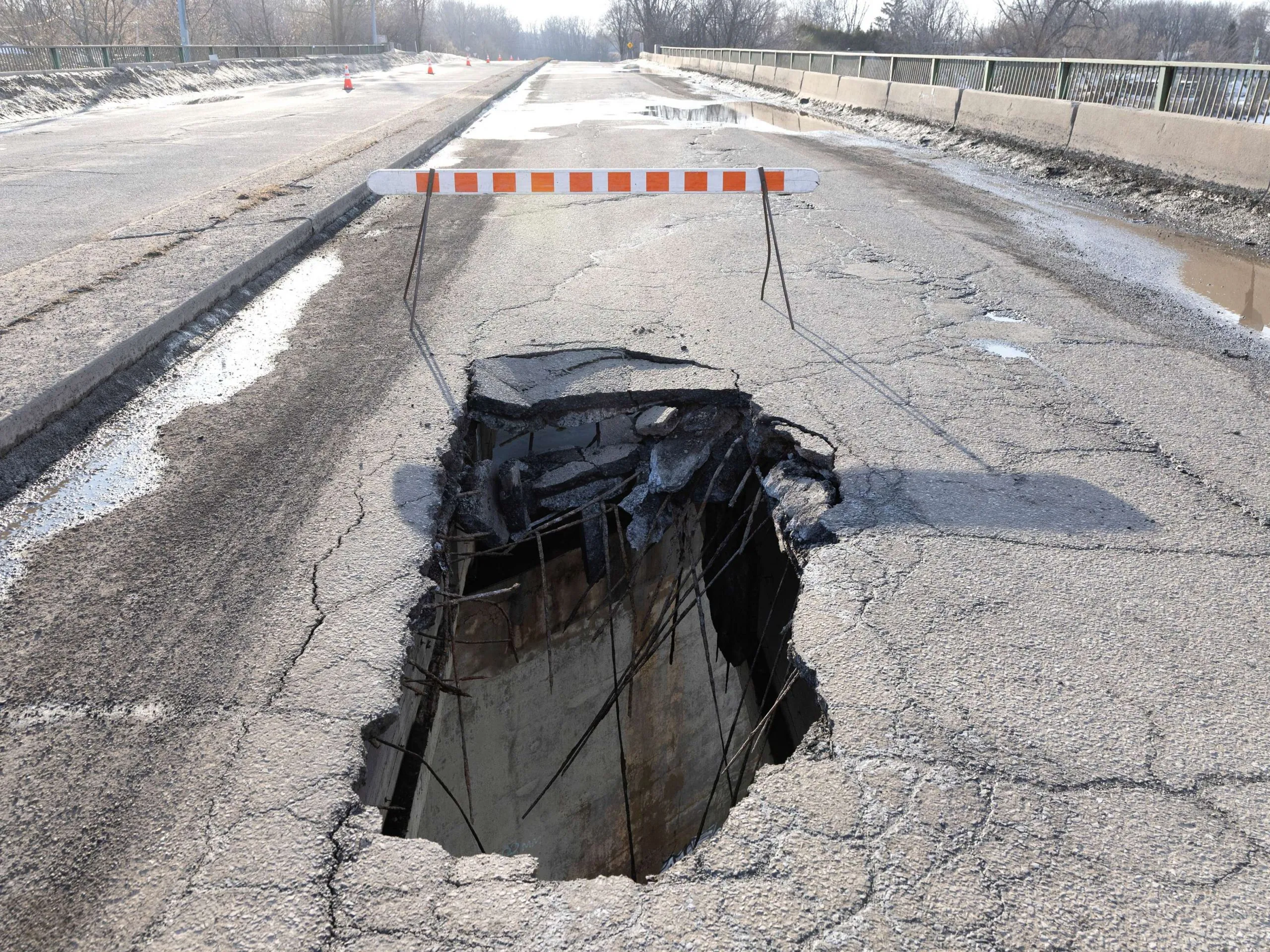 El alcalde de la ciudad, Eric Allard, informó que el daño dejó un gran agujero visible en medio de uno de los carriles del puente, además de barras de refuerzo expuestas que evidencian el deterioro de la estructura.